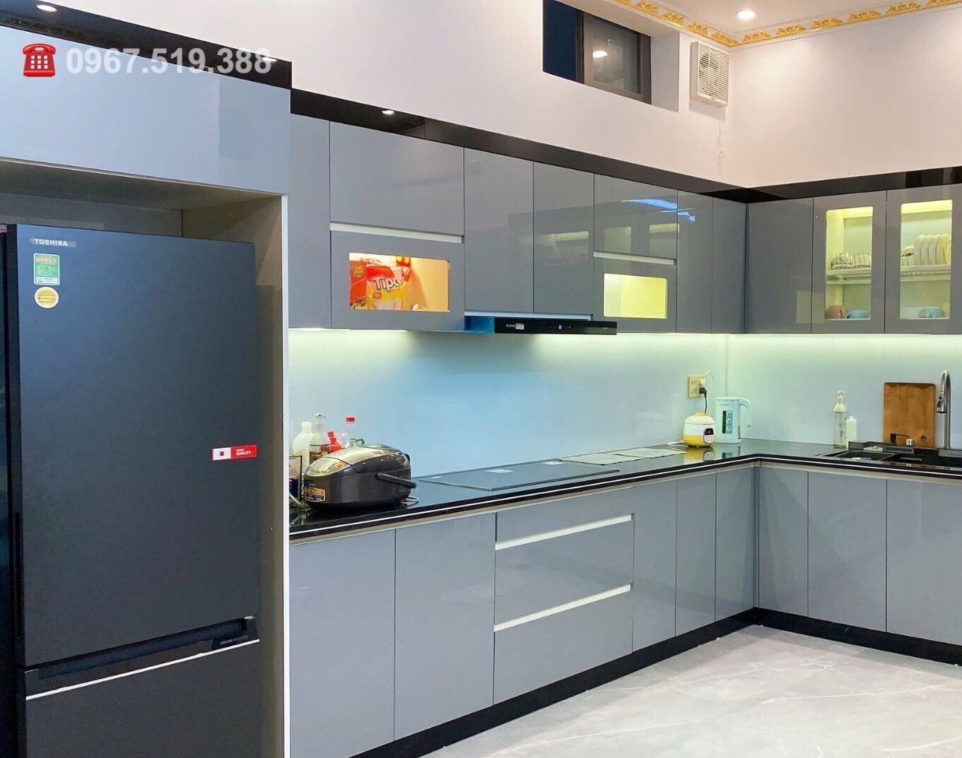 Lắp đèn led tủ bếp giúp chiếu sáng khu vực làm bếp, giúp công việc nấu nướng trở nên an toàn và dễ dàng hơn. Đèn được lắp âm dưới kệ hoặc dán LED dây quanh mép tủ trên.